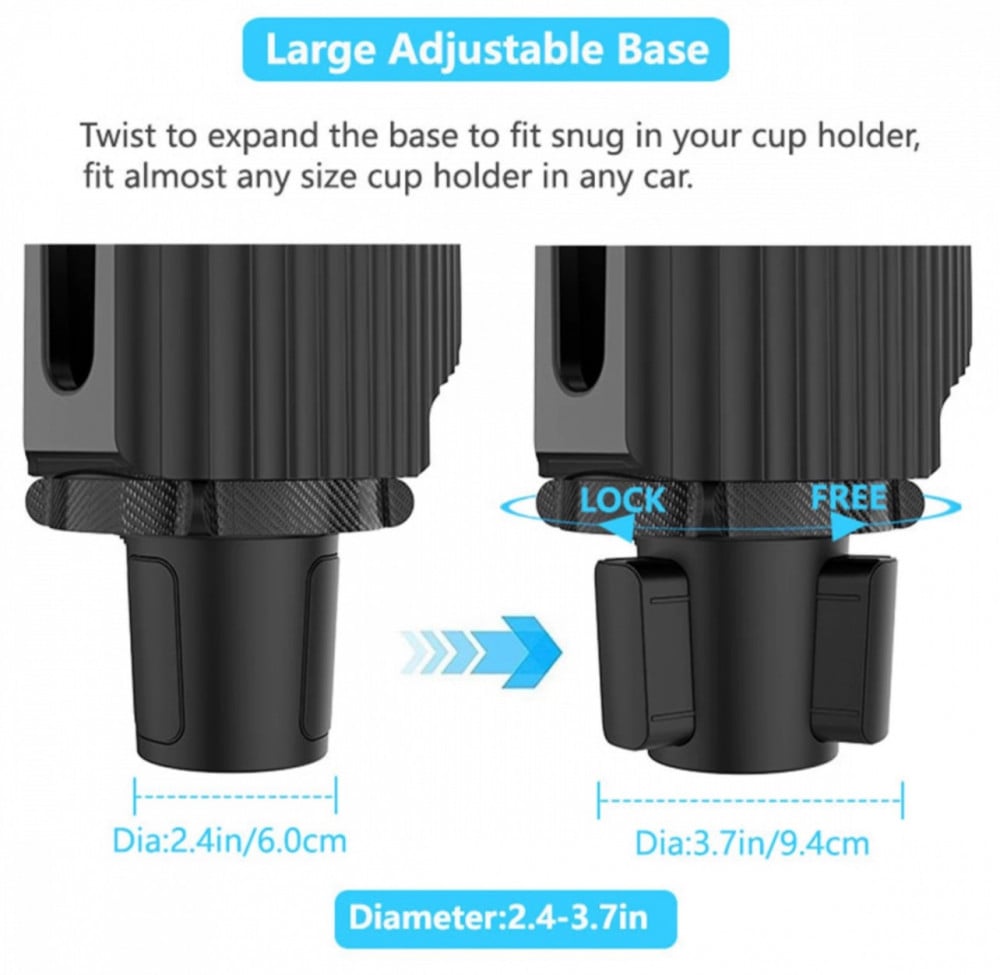 - قابلة للتعديل لتوسيع القاعدة لتناسب حامل الأكواب الخاص بك وتناسب تقريبًا أي حجم حامل أكواب في أي سيارة بقطر 2.4 بوصة / 6.0 سم أو قطر 3.7 بوصة / 9.4 سم.
